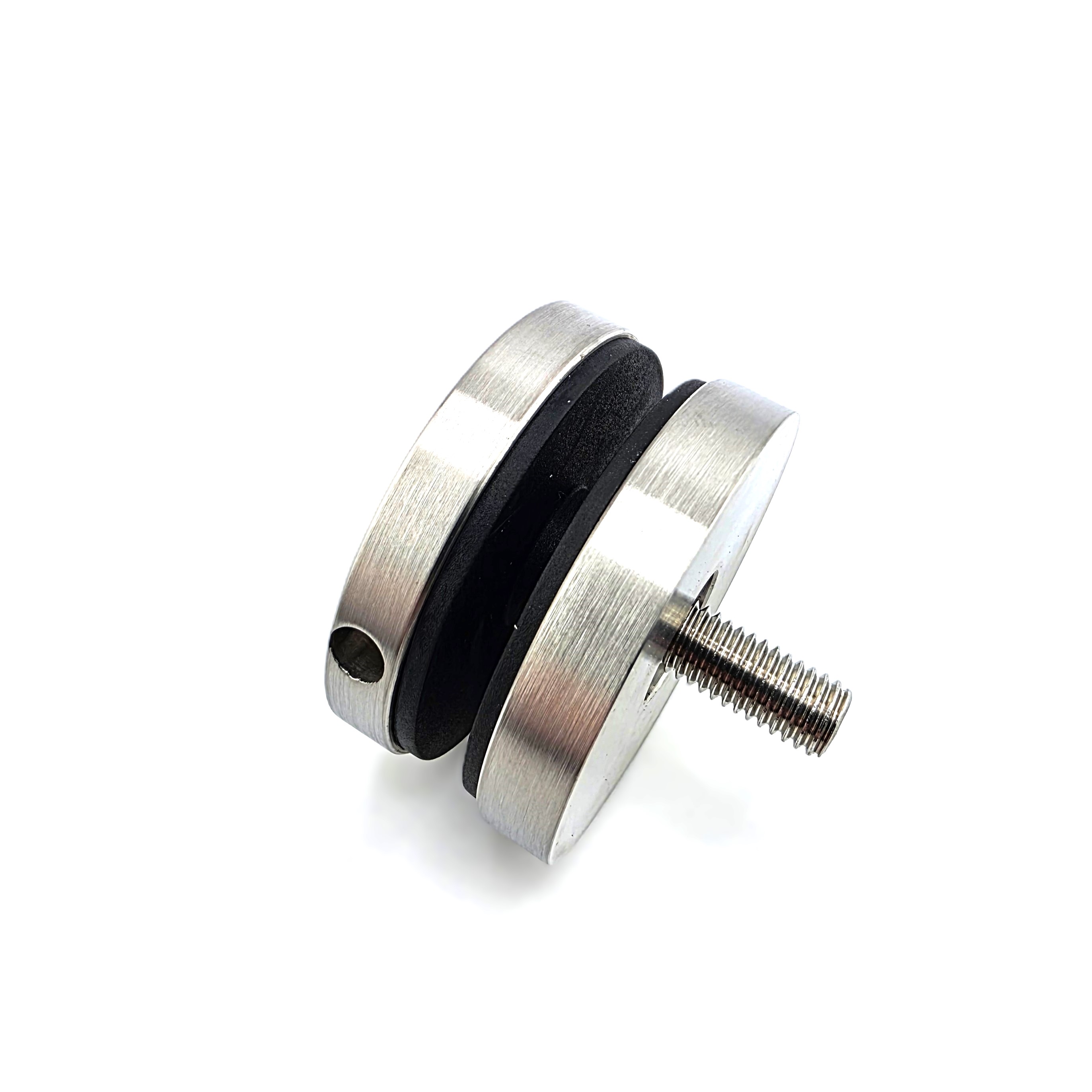 Größere Punkthalter werden standardmäßig mit flachem Anschluss hergestellt. Um hier auf andere Einbausituationen reagieren zu können, sind verschiedene Unterlegscheiben mit Radien für die im Metallbau oft verwendeten Rohre erhältlich.